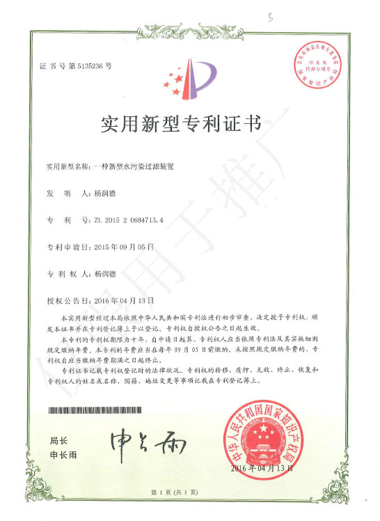 實用新型專利證書-高效速生節能一體化汙水處理裝置
